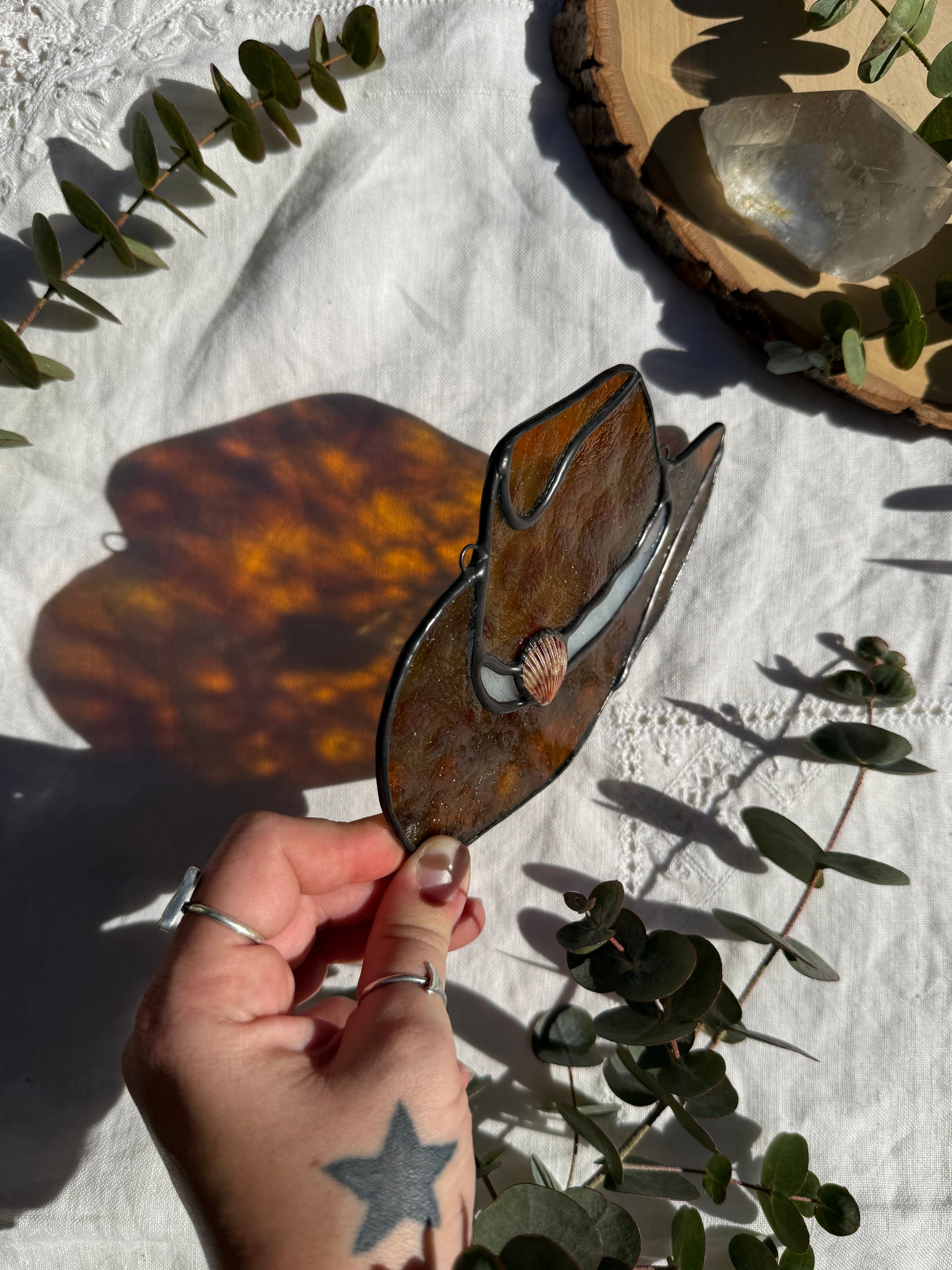 Bronze and cream stained glass coastal cowgirl hat with a scallop shell inclusion and black patina. Measures 6in x 4in. Will come with chain attached.