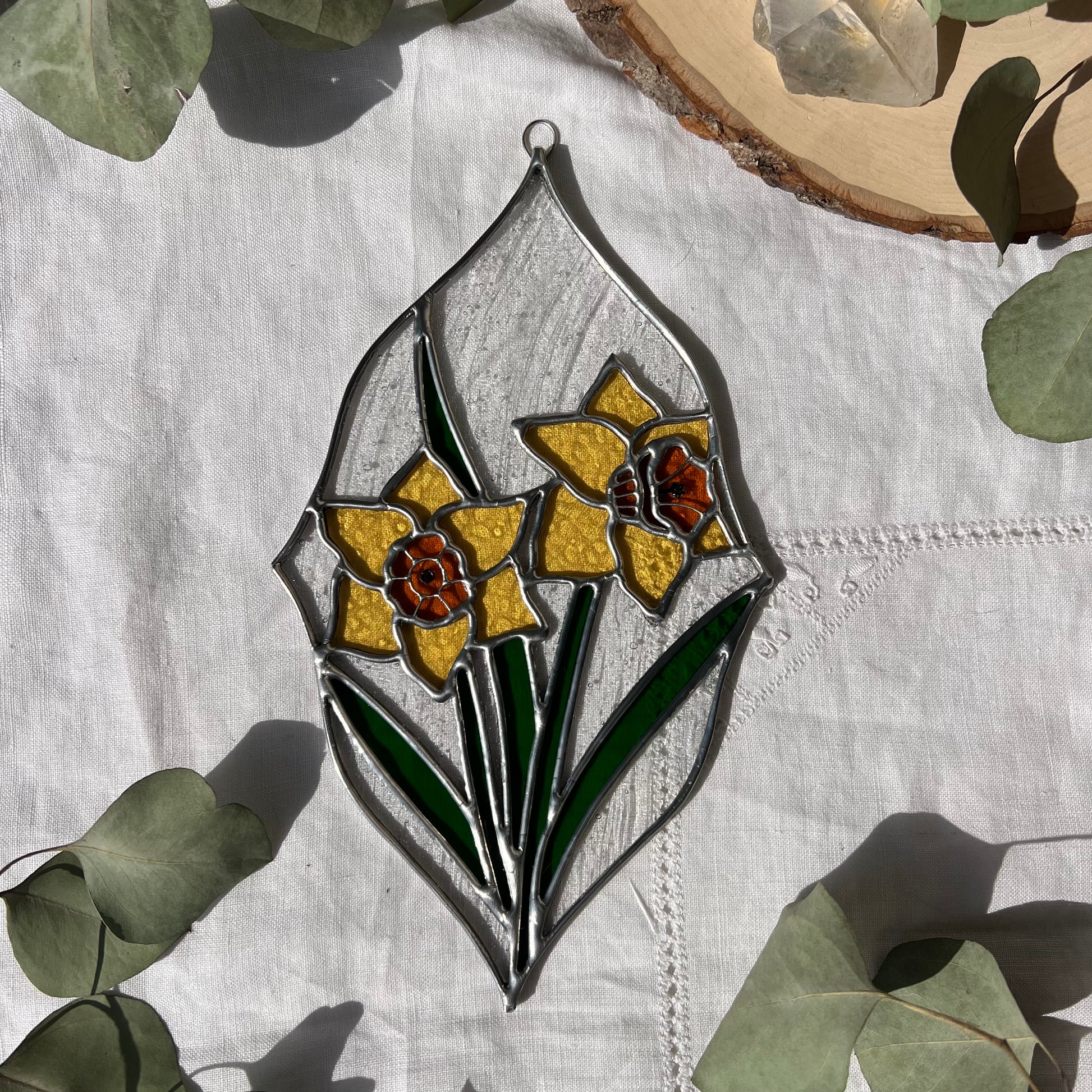 Yellow, orange, green and clear stained glass daffodil panel with wire and hand painted details. Measures 10.75in x 6in.