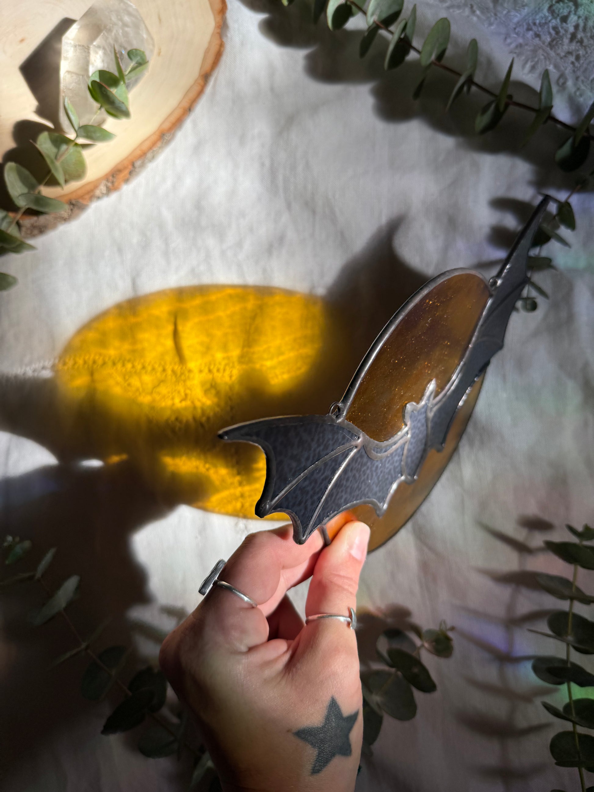 Dark gray bat with iridescent golden glass moon stained glass sun catcher with black patina. Measures 8.75in x 5in.