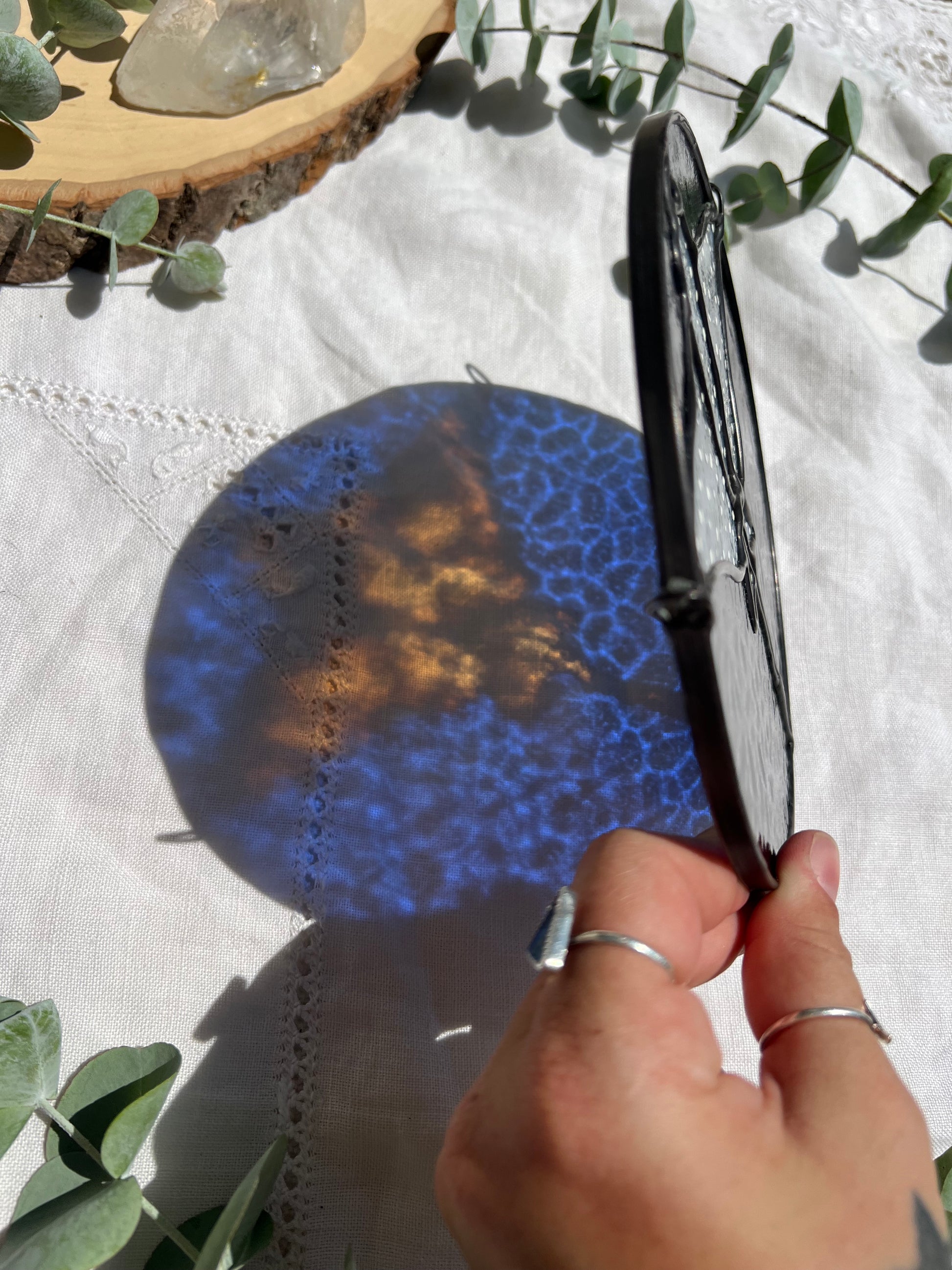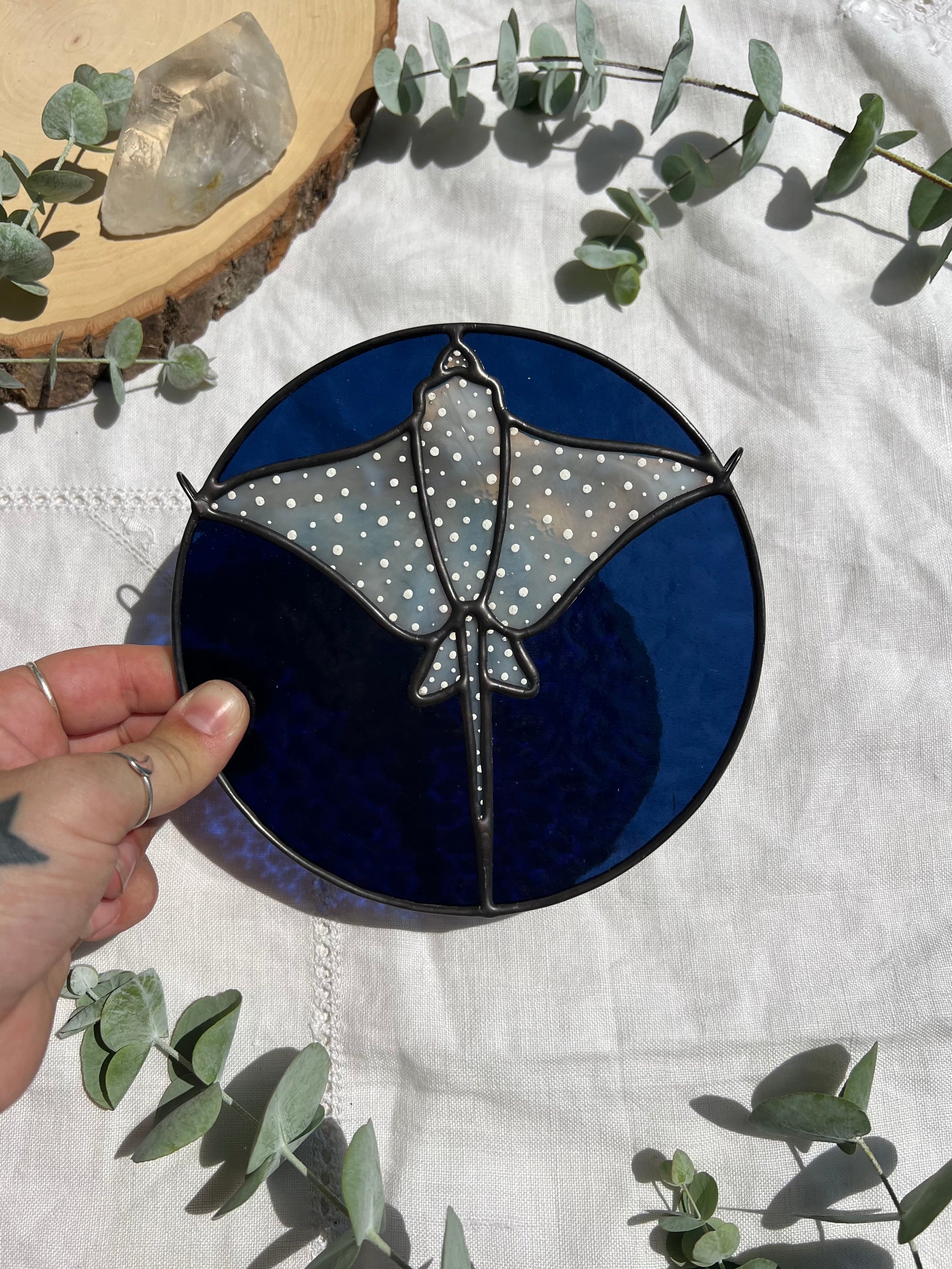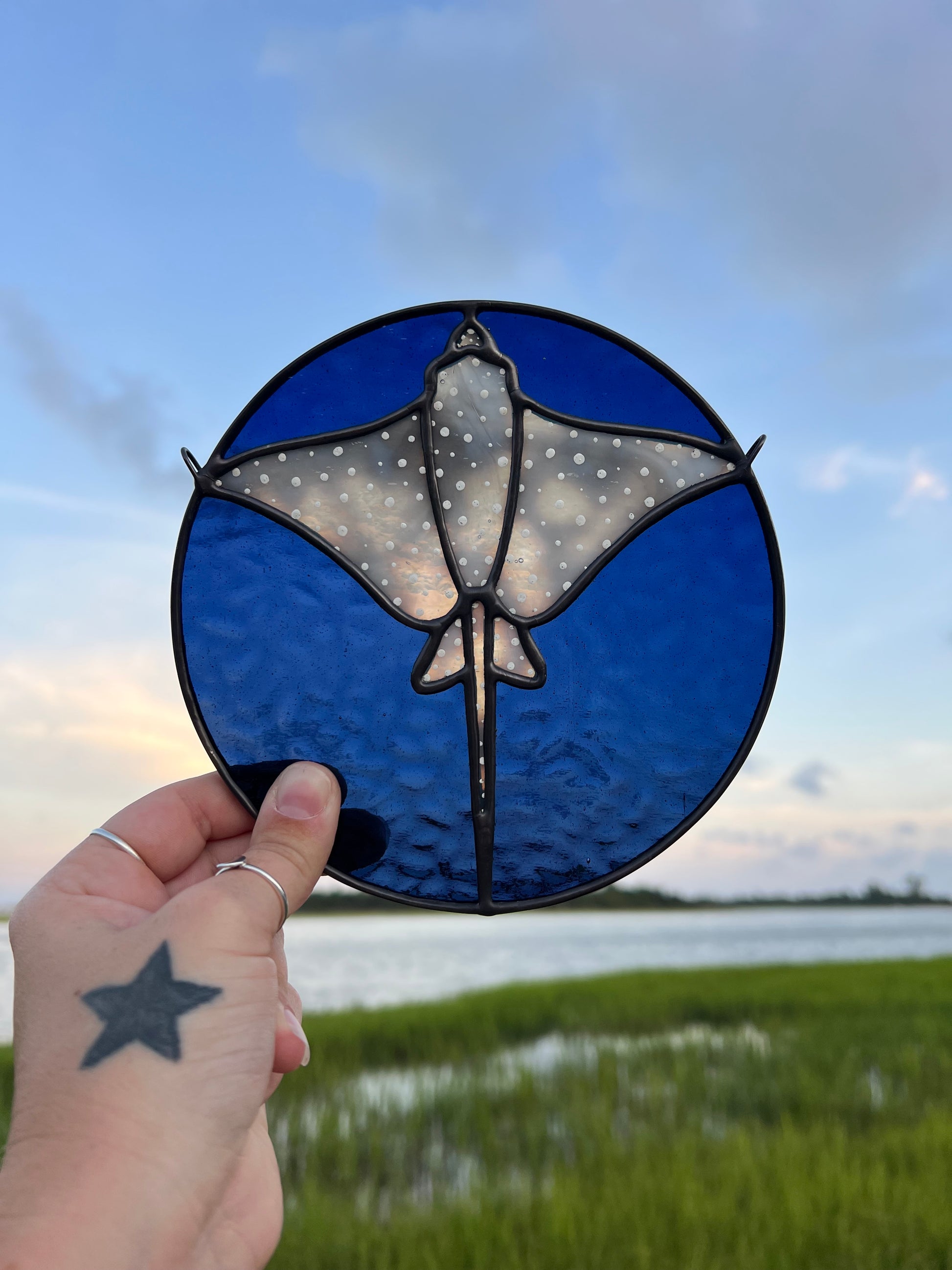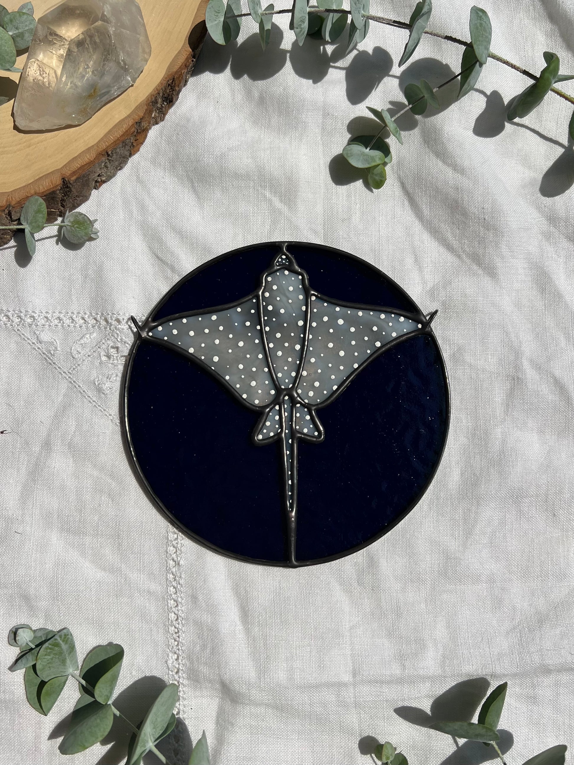 Gray ring mottled eagle ray with a dark blue background, black patina, and hand painted details. Measures 6in x 6in. Chain will be included.
