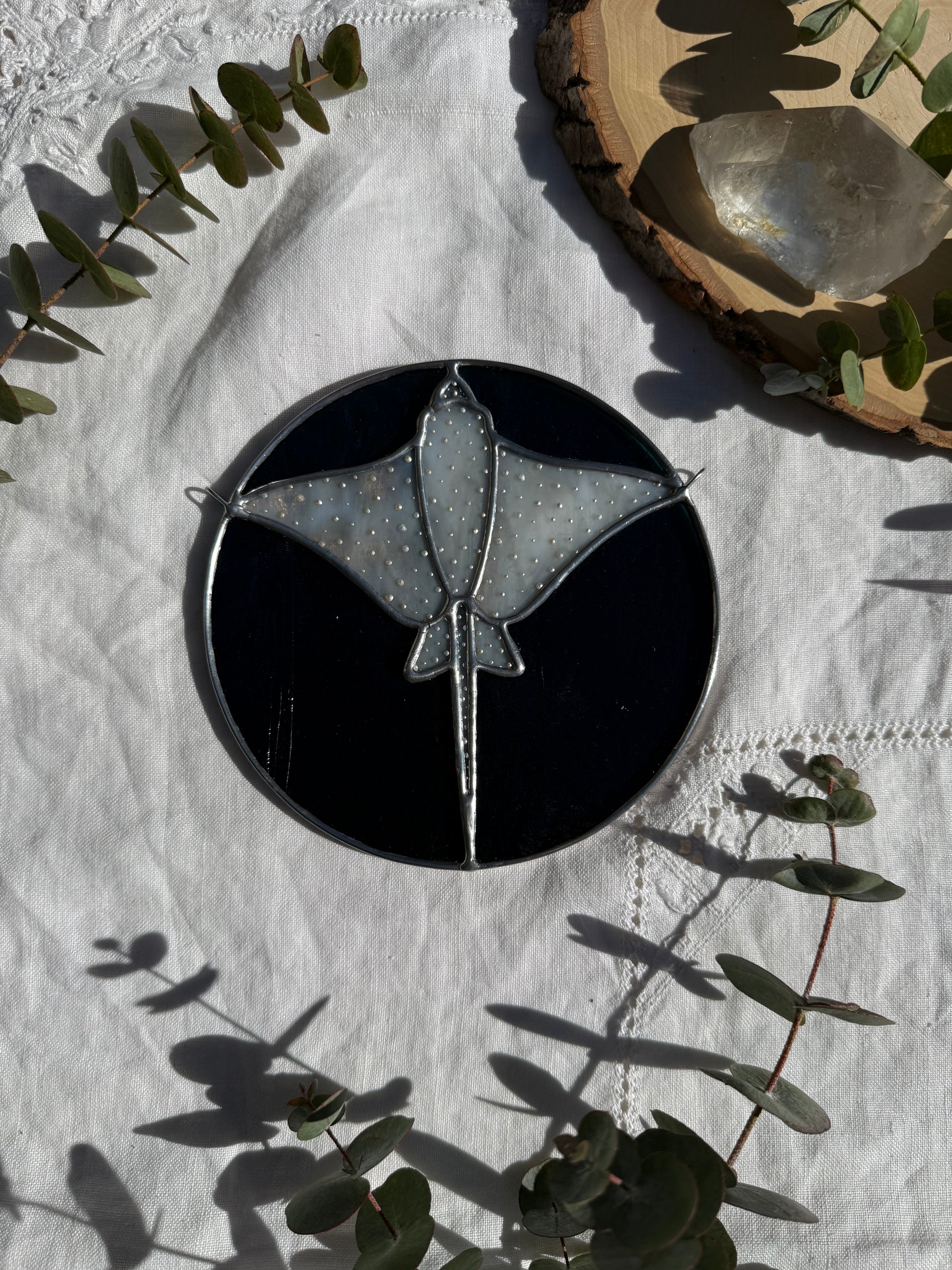 Gray ring mottled stained glass eagle ray with a deep teal background and hand painted details. Measures 6in x 6in. Will come with chain attached.