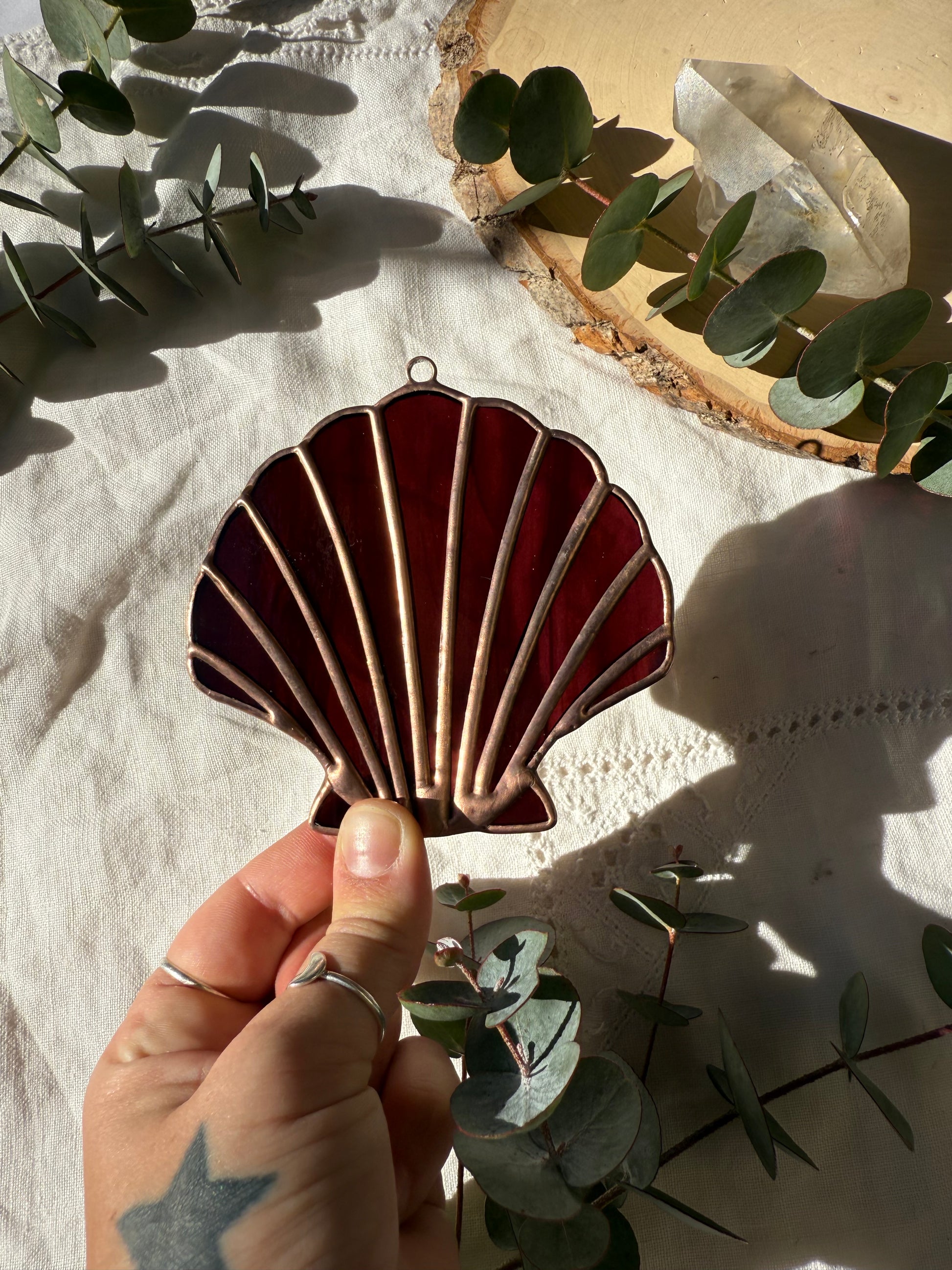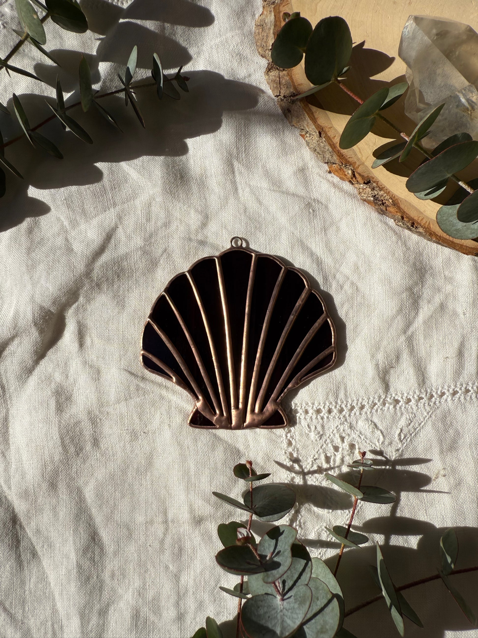 Wispy magenta stained glass scallop shell sun catcher with copper patina. Measures 4in x 3.75in.