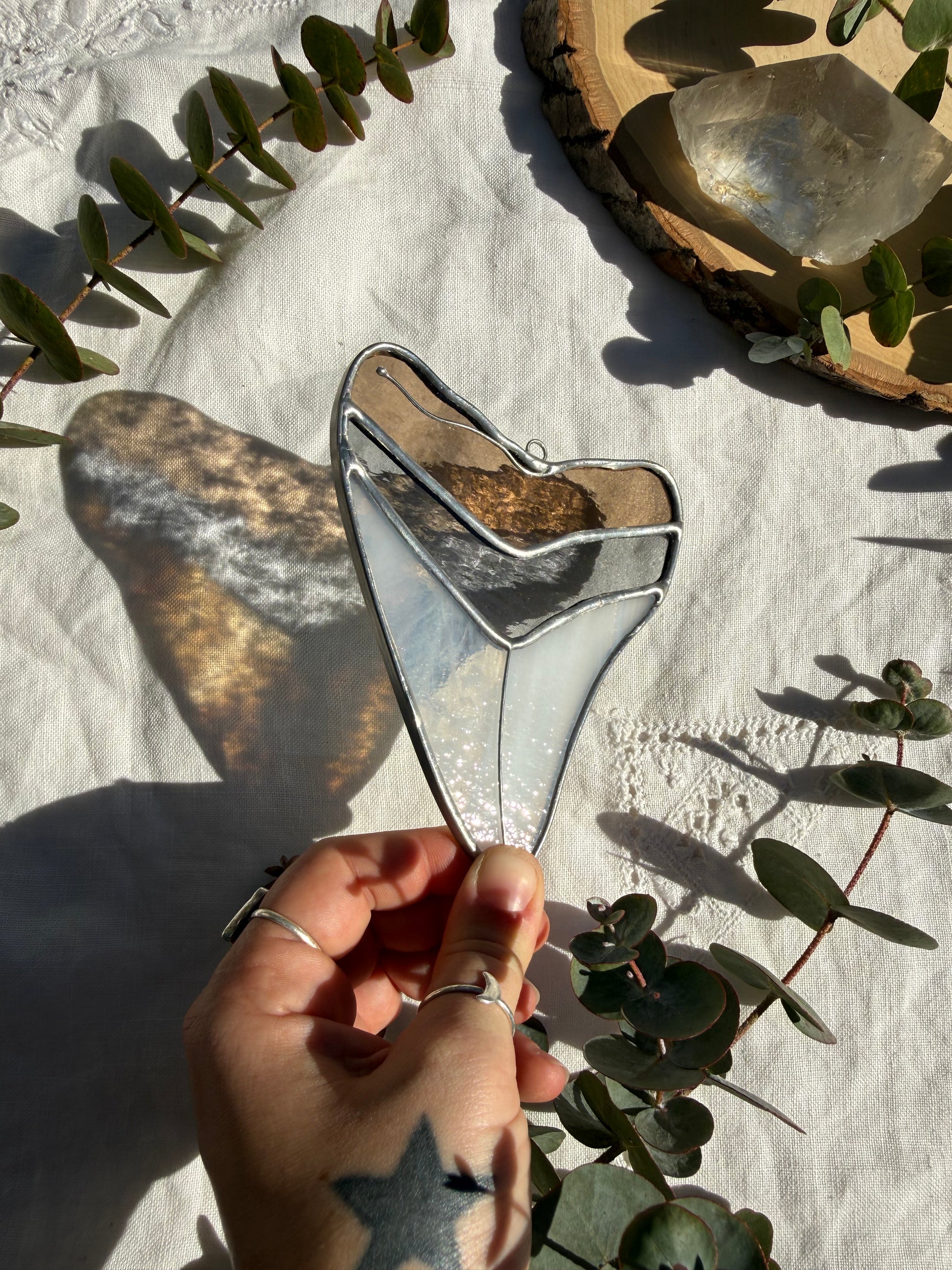 Bronze, gray, and white stained glass Megalodon shark tooth sun catcher with wire details and black patina. Measures 4.75in x 4in.
