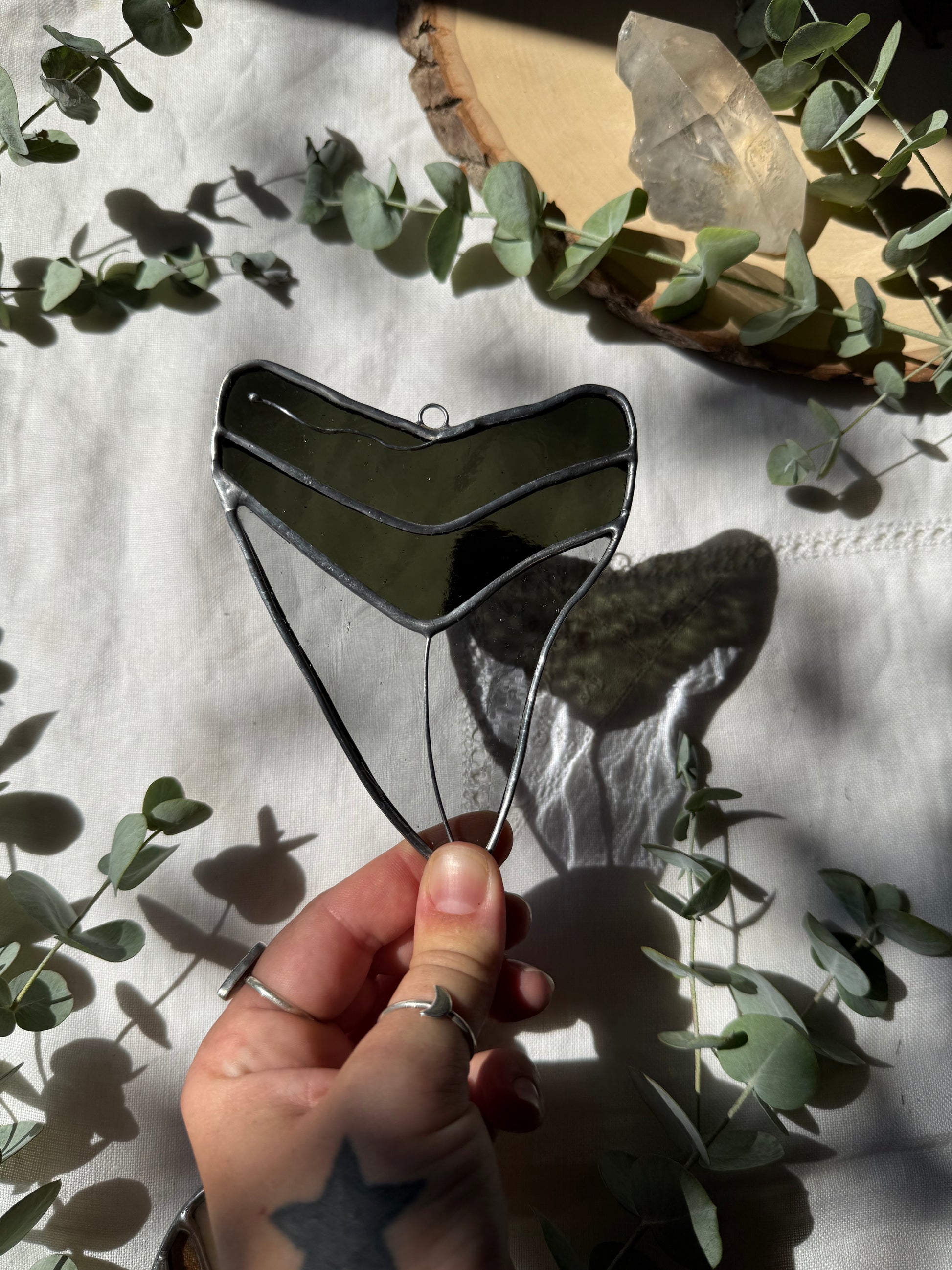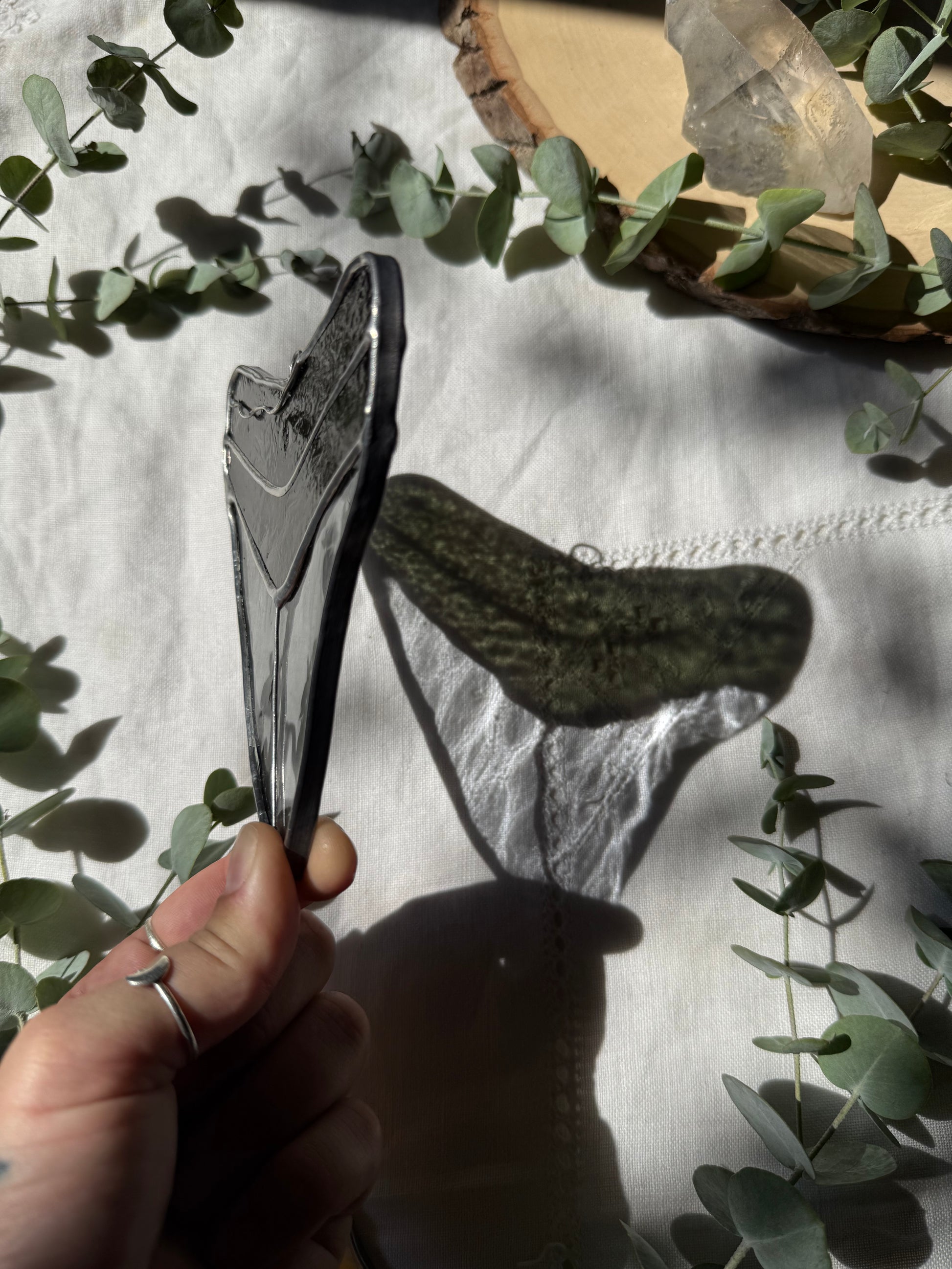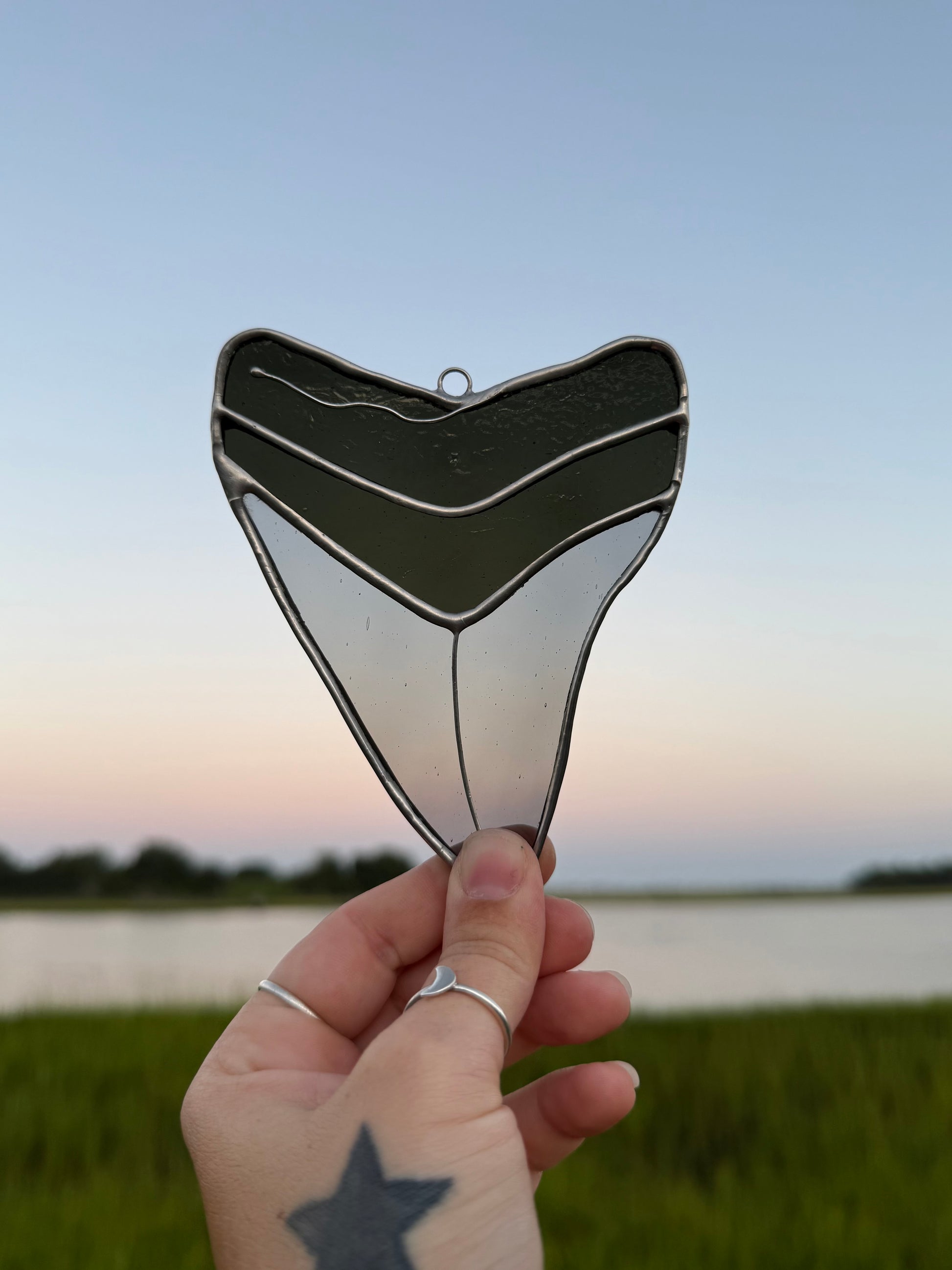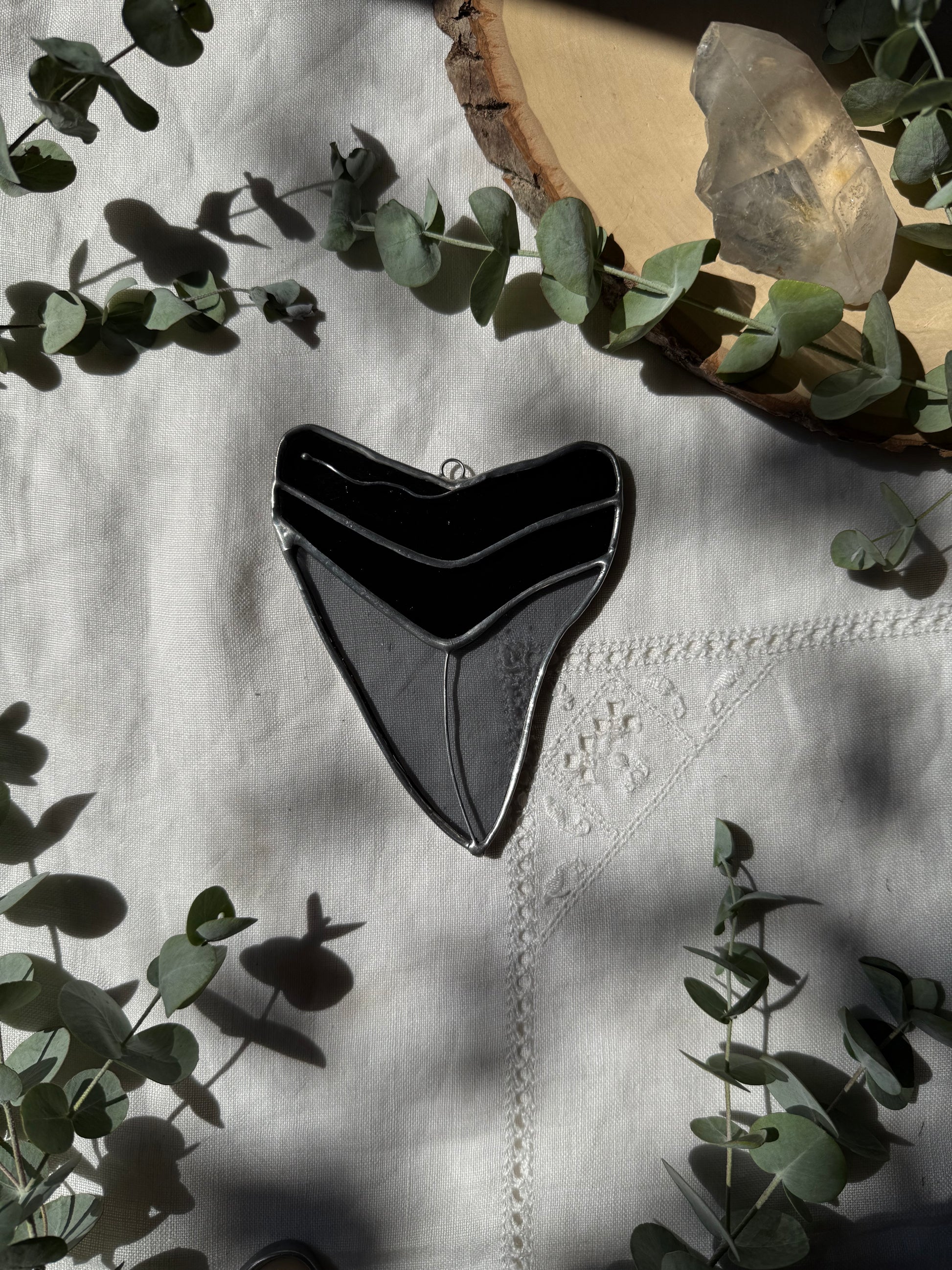 Dark gray and pale gray glass Megalodon shark tooth sun catcher with wire details. Measures 4.75in x 4in.