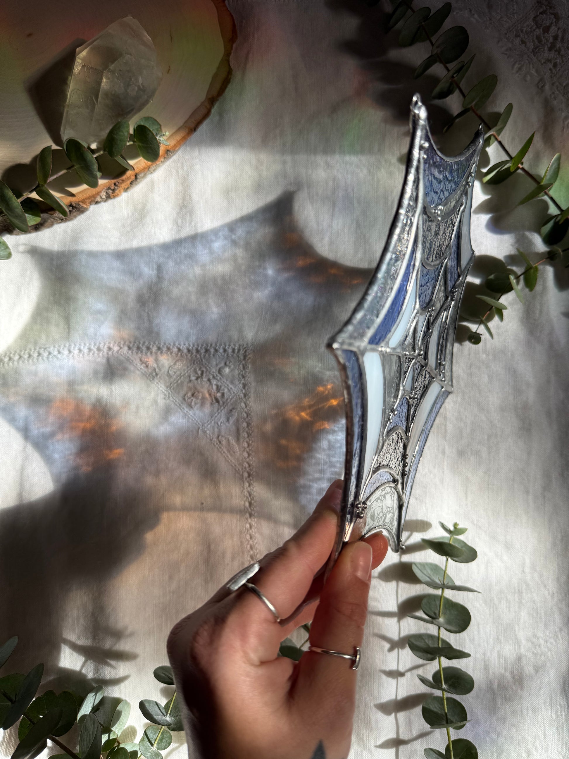 Purple, clear iridescent, white, and textured clear stained glass spider web with solder details. Chain to hang will be included. Measures 8in x 9.5in.