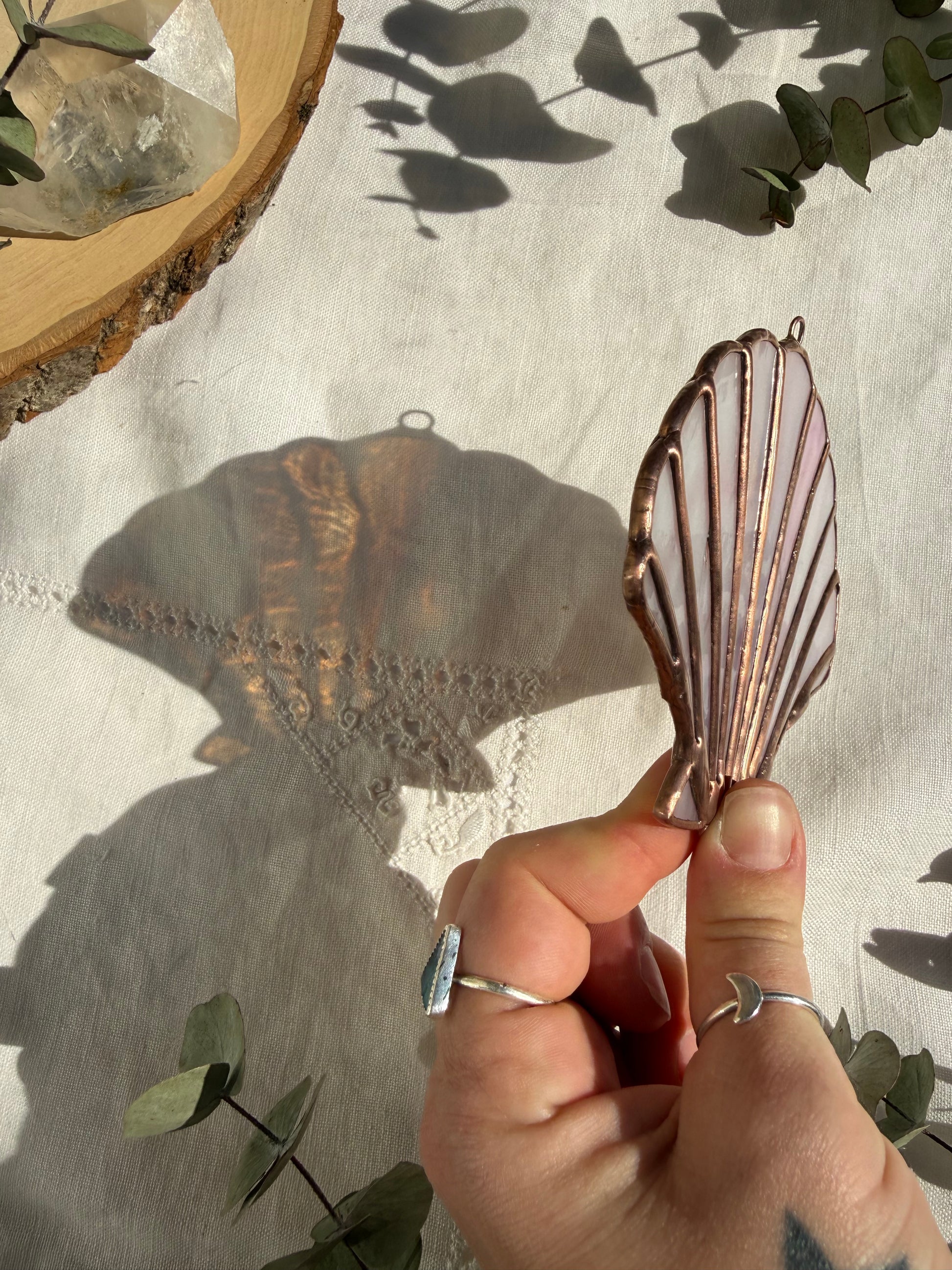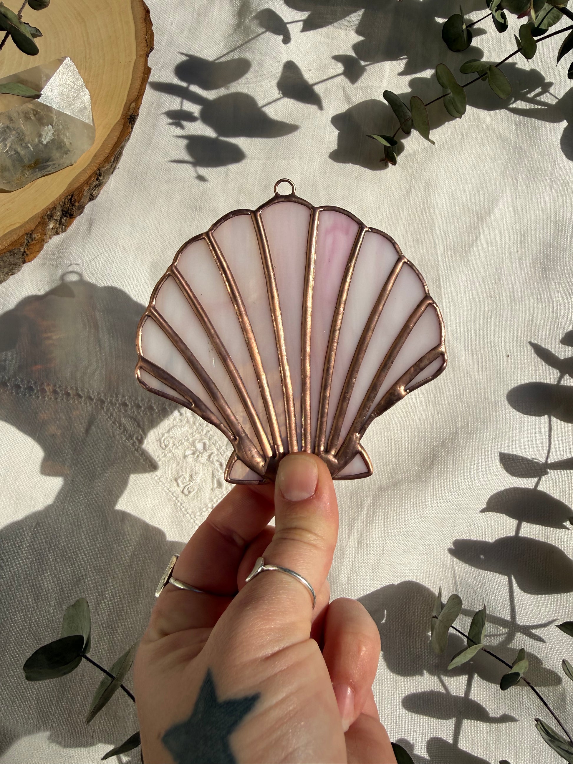 Pale wispy pink stained glass scallop shell sun catcher with copper patina. Measures 4in x 3.75in.