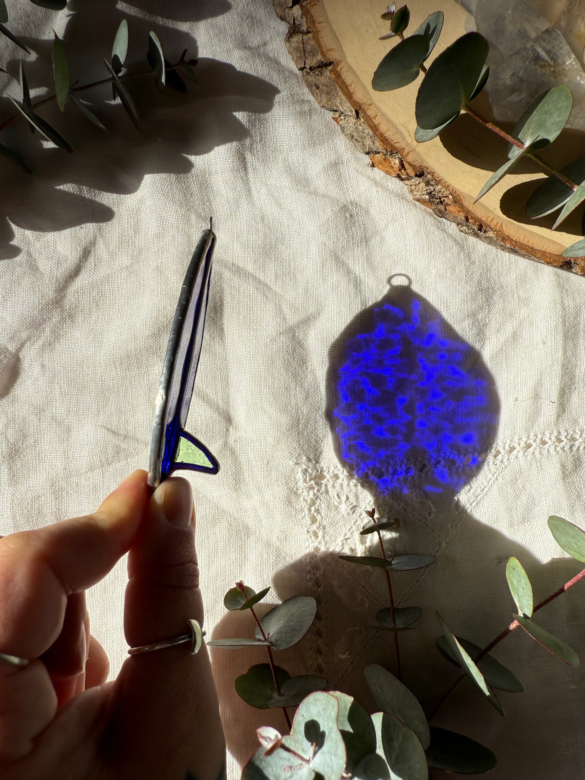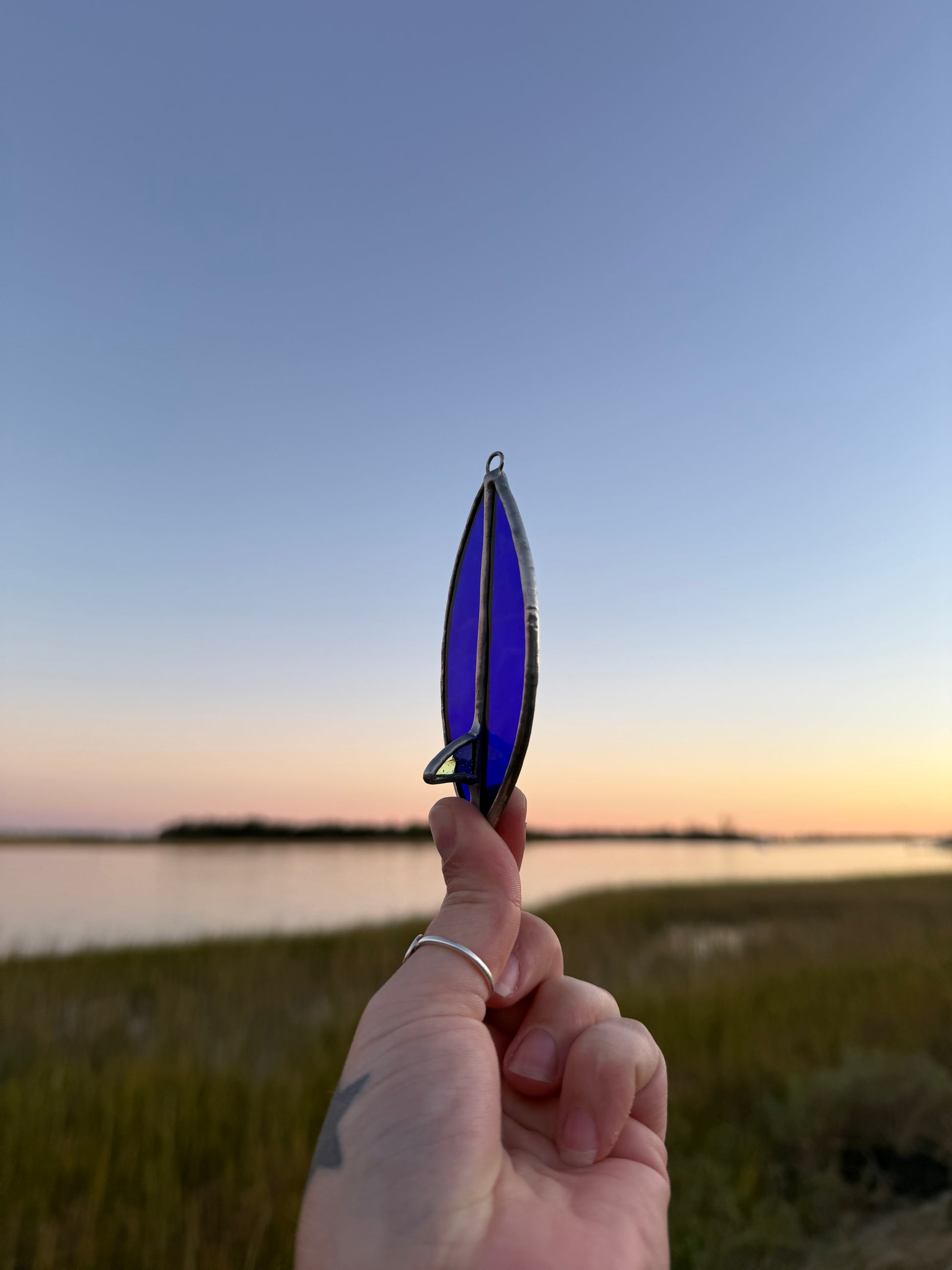 Deep blue surfboard with a pale green fin stained glass ornament. Measures 3.5in x 1.5in.
