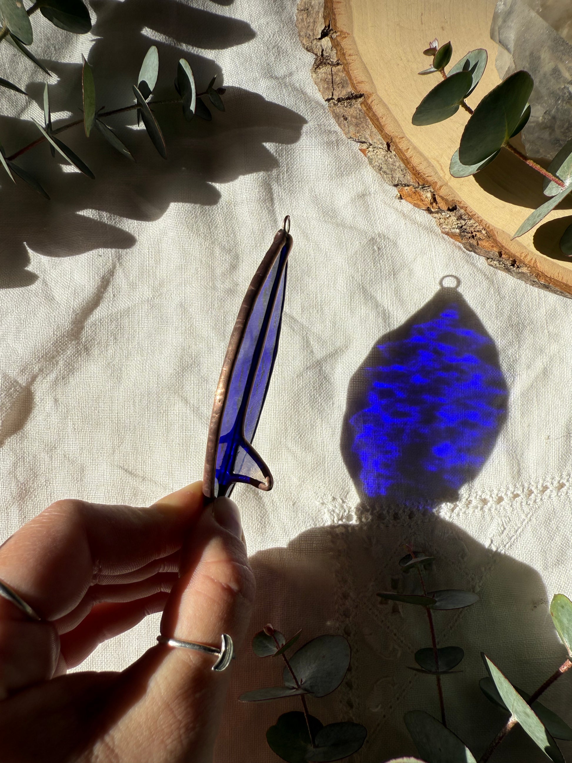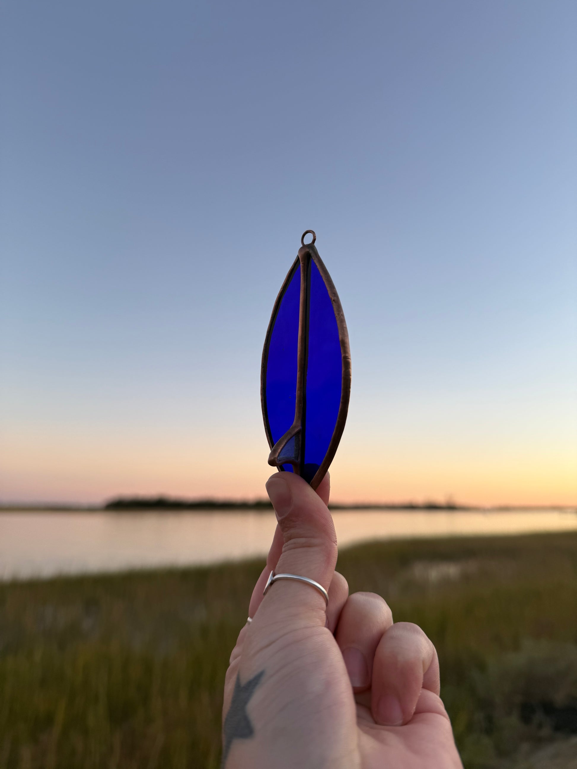 Deep blue surfboard with a white fin stained glass ornament with copper patina. Measures 3.5in x 1.5in.