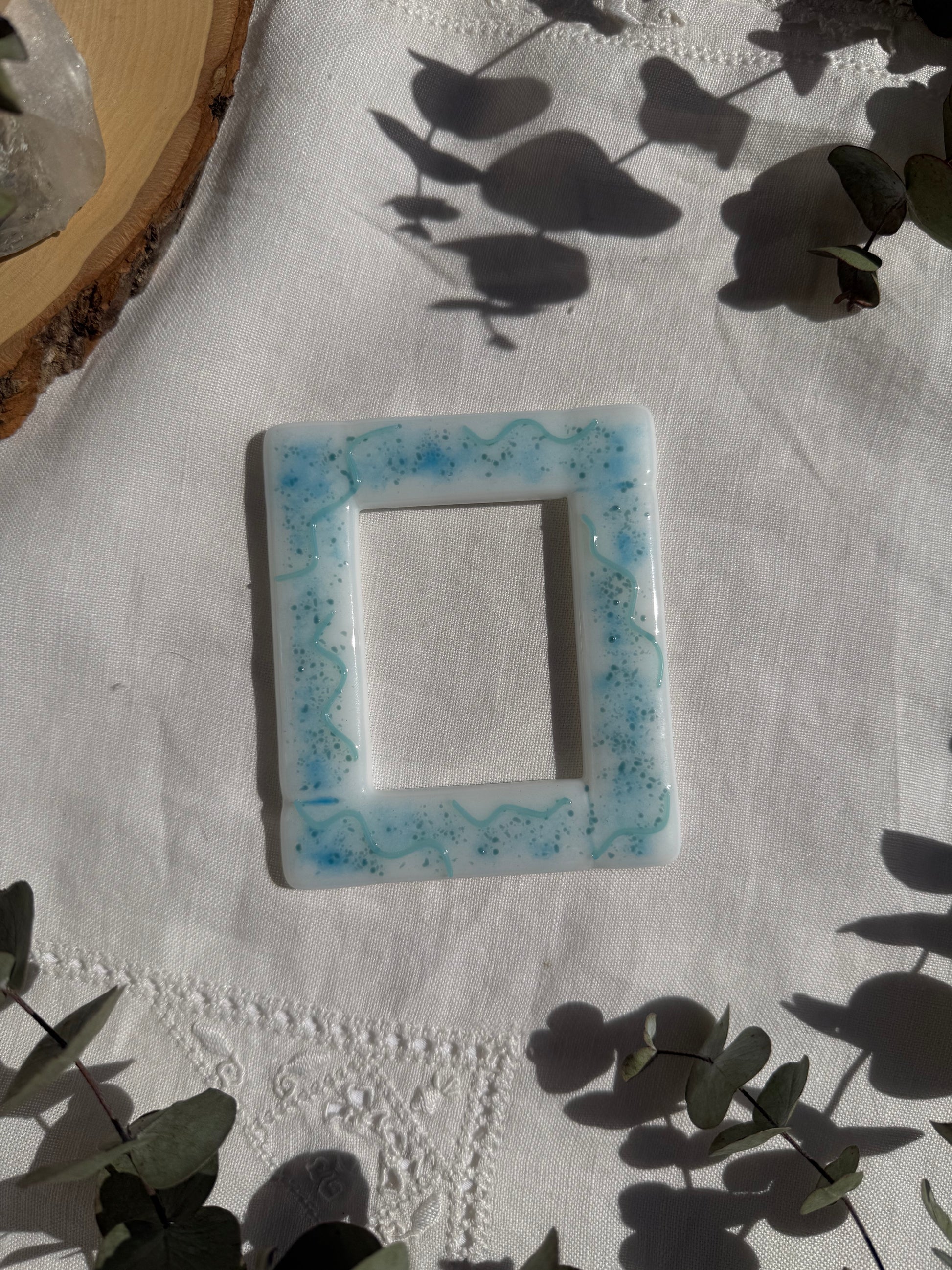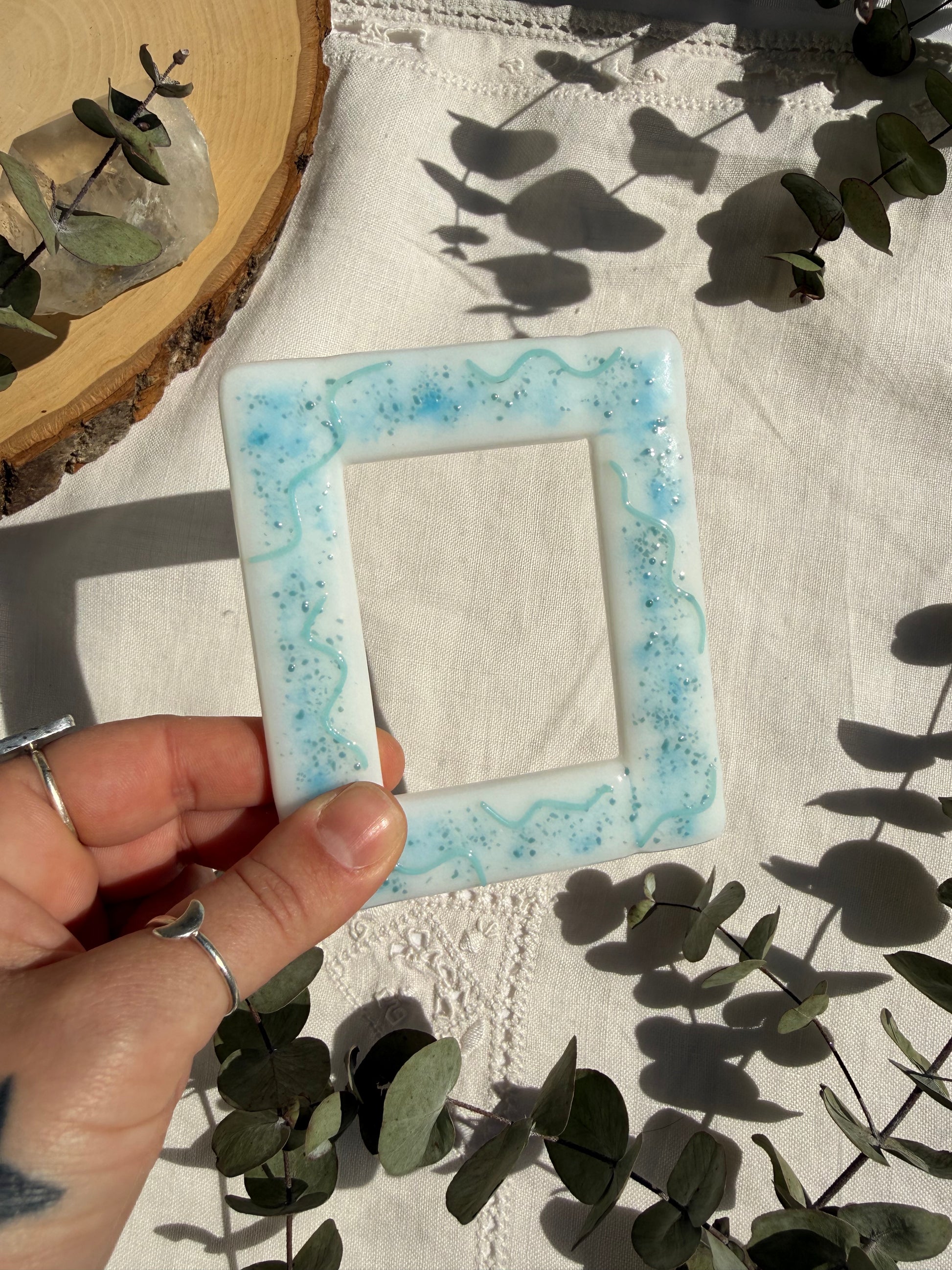 White fused glass magnetic frame with turquoise squiggles and marine green flecks. Fits the fujifilm instax mini film (3.25in x 2.25in) or similar sized photo. Full frame measures 4in x 3.25in.