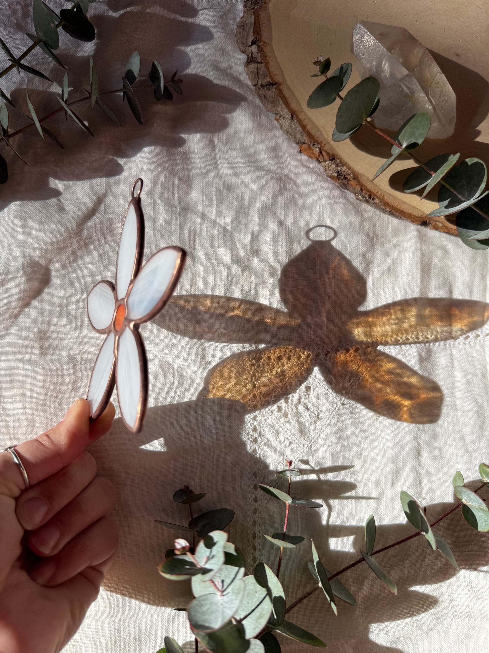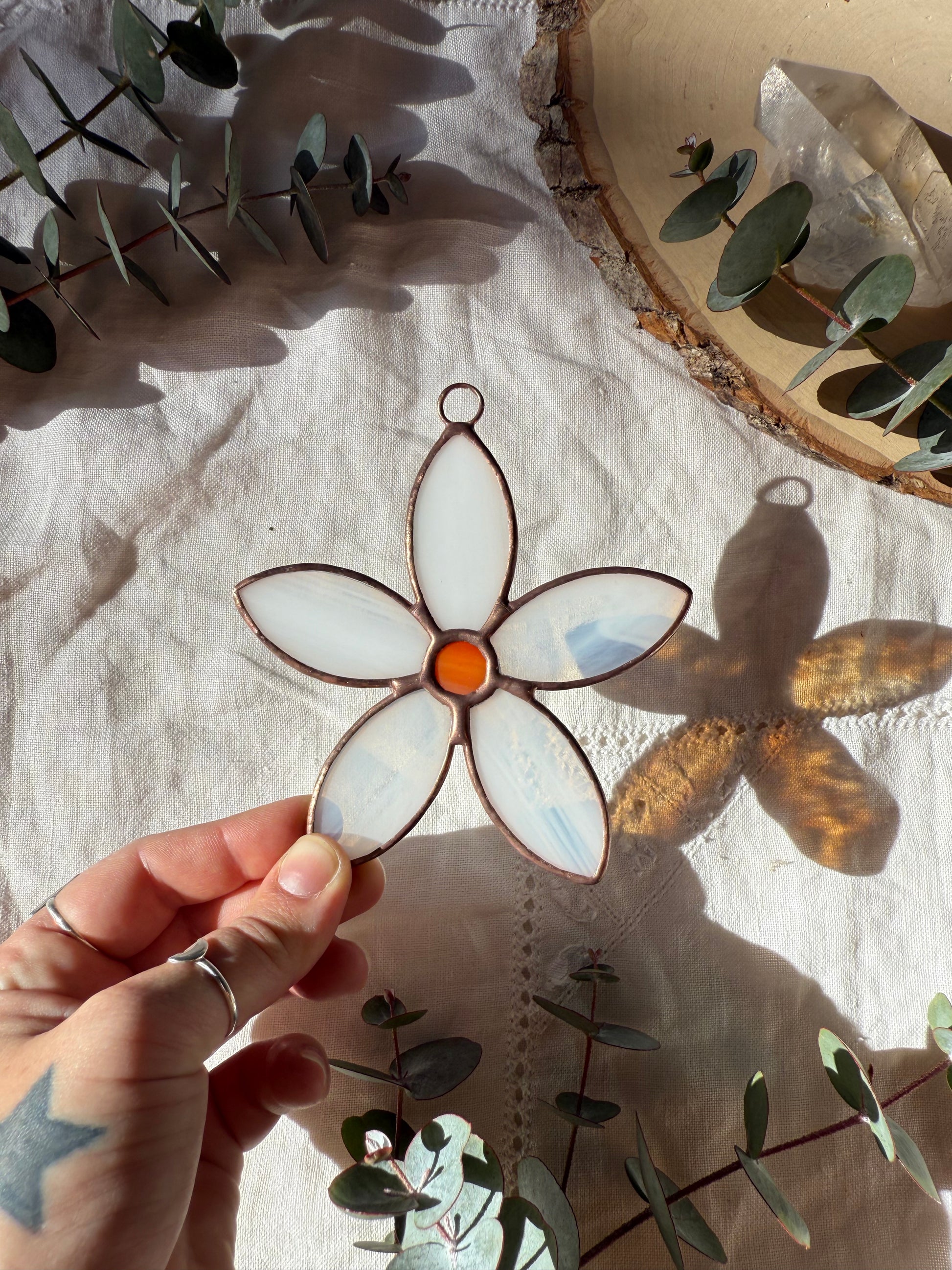 Wispy white stained glass flower ornament with an orange center. Measures 4.25in x 4.25in.