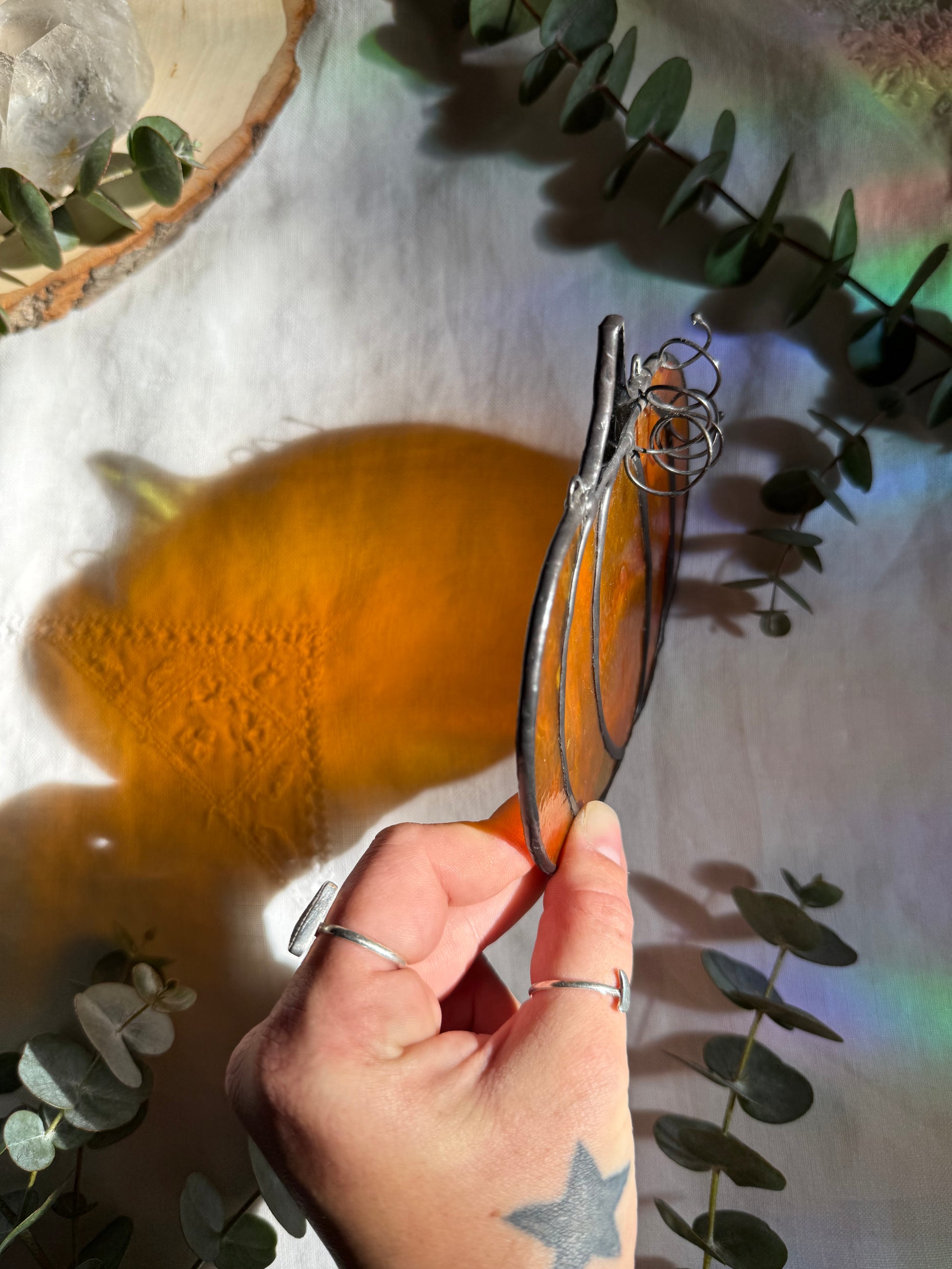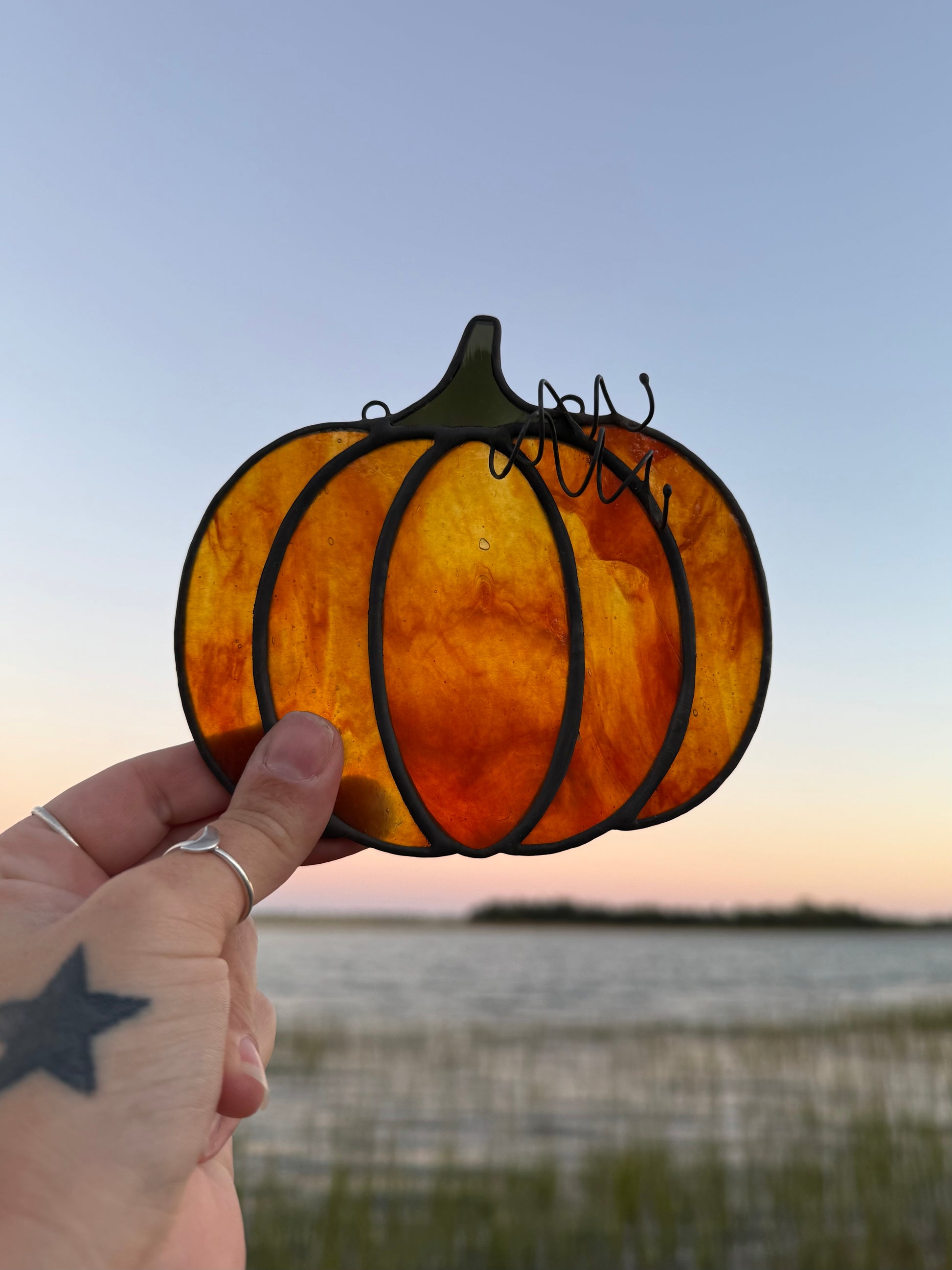 Wispy orange and amber stained glass pumpkin sun catcher with an olive green stem, black patina and wire details. Measures 5in x 4.5in.